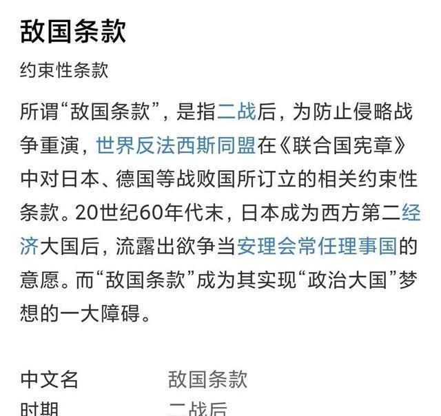 更关键的是,在这份文件中,中国明确援引了《联合国宪章》里的硬核内容,敌国条款。 这个条款之所以震撼全场,是因为它是国际法史上最罕见、最特殊、最不留情面的条款之一。 它的存在意义,从来不是为了摆设,而是为了警醒世界,在二战废墟中总结出的教训,不允许被任何国家抹去。 条款内容简单却锋利,只要日本、德国或意大利出现“再次实施侵略政策的任何步骤”,包括中国在内的五大创始国,有权立即采取军事行动,不需经过安理会授权。