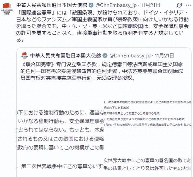 日本的真正问题,不在于说了什么,而在于它正在摆脱历史约束这条路上越走越快、越走越远。 中国这次态度异常强硬,本质上不是“中日之间的怒火”,而是为了告诉世界,如果战后秩序连日本都可以随便挑战,那这个世界将变得危险而不可预测。 中国引用敌国条款实际上是拿出了国际体系中最高级别的“历史警告标志”。 不是为了吓唬日本,而是为了告诉所有国家,如果谁敢破坏二战后的制度基础,那么制度保护者就会依法反制。